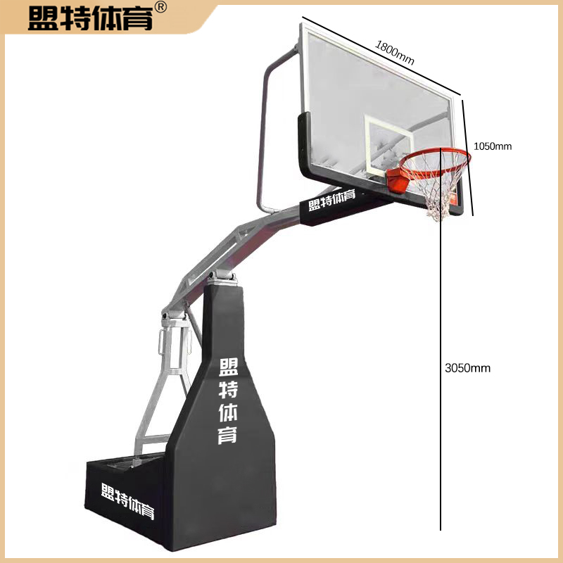 篮球架的移动底箱:优质钢板制成,尺寸为:30cm(高)*100cm(宽)*180cm(长),移动底盒里装负重物,以保证在使用时的稳定性。